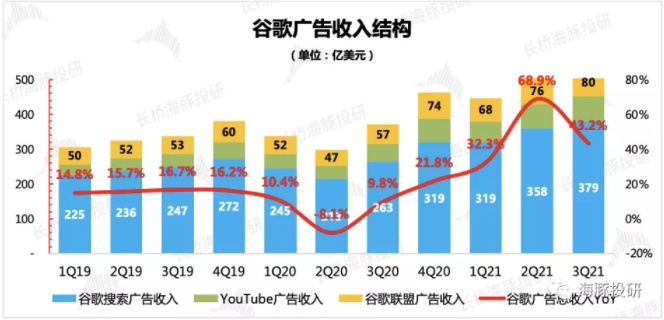 不过,长桥海豚君在讨论《苹果隐私新政对Facebook影响》中,也明确提到隐私政策对FB等平台的个性化推荐广告投放效率存在削弱,因此短期可能会看到部分广告主将部分广告预算转移到其他广告类型上,比如搜索广告等。基于这个逻辑,谷歌的搜索广告短期在苹果iOS隐私影响期间反而会获得更多的投放需求。