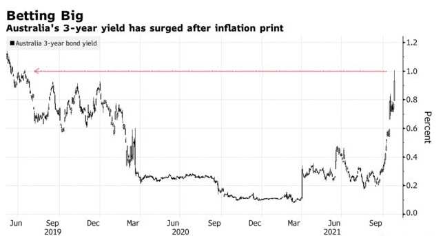 澳大利亚三年期国债收益率攀升至2019年7月以来的最高水平,原因是三季度CPI上涨超预期,市场加大了对澳洲联储加息的押注。