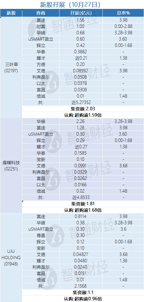 智通财经APP获悉,三叶草生物-B(02197)、鹰瞳科技-B(02251)、UJU HOLDING(01948)正在招股中。截至10月27日,富途、耀才、辉立、华盛等合计分别为其借出孖展近5.27352亿港元、近4.8533亿港元、2.1568亿港元。其中,三叶草生物-B超购逾1.59倍,鹰瞳科技-B超购逾1.68倍,UJU HOLDING超购逾0.96倍。