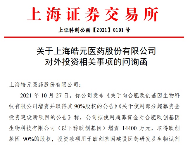 智通财经APP获悉,10月27日,上交所向皓元医药(688131.SH )发出问询函。问询函指出,皓元医药于10月27日发布公告称,公司拟使用超募资金对合肥欧创基因生物科技有限公司(以下称欧创基因)增资14400万元,取得欧创基因 90%的股权,投资款项用于欧创基因建设医药研发及生物试剂研发产业化基地项目(以下称本次投资)。上交所要求皓元医药补充披露“欧创基因的具体情况;本次投资完成后欧创基因的业务发展规划和核心团队安排;本次投资的必要性,以及皓元医药与欧创基因在人员 、产品、技术、研发等方面是否存在协同效应;本次投资的合理性以及定价公允性”等事项。