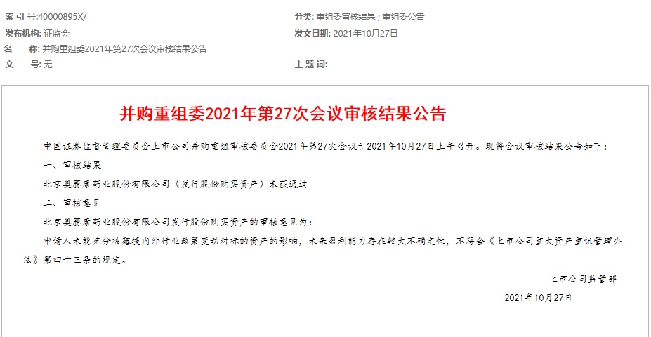 智通财经APP获悉,据证监会官网消息,证监会并购重组委于10月27日召开会议审议奥赛康(002755.SZ)(发行股份购买资产)事项。奥赛康重组事项未获通过。对此,并购重组委出具的审议意见是申请人未能充分披露境内外行业政策变动对标的资产的影响,未来盈利能力存在较大不确定性。