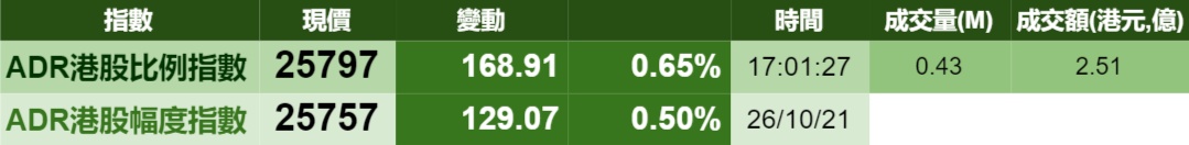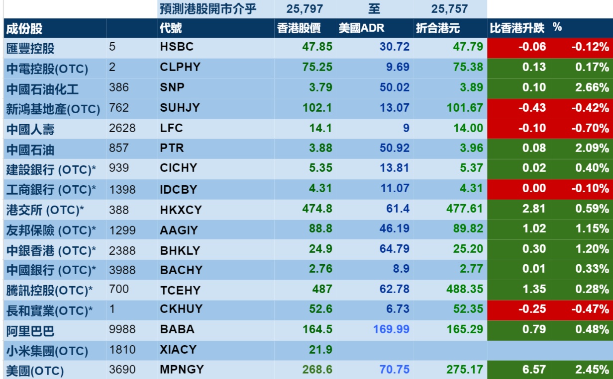 智通财经APP获悉,周三美股三大指数集体微跌,港股ADR指数上涨,按比例计算,收报25797点,涨168.91点或0.65%。