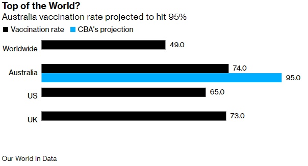 在疫苗接种率方面,CBA澳大利亚经济负责人Gareth Aird称,“接种率将是健康结果的关键驱动因素,进而影响经济结果。”他补充说,全国接种率达到95%是切实可能的。“这将使澳大利亚成为世界上接种疫苗最多的国家之一。至关重要的是,这将意味着‘与新冠病毒共存’的破坏性要小得多。”