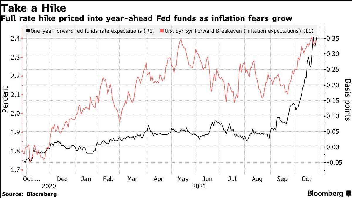 持续通胀的威胁仍然是投资者的热门话题,从方舟投资的凯西•伍德、特斯拉的马斯克,再到美国前财长Larry Summers,所有人本周都在讨论这个话题。尽管部分人赞同美联储的观点,认为物价上涨将是暂时的,但也有越来愈多的交易员正提前押注加息。