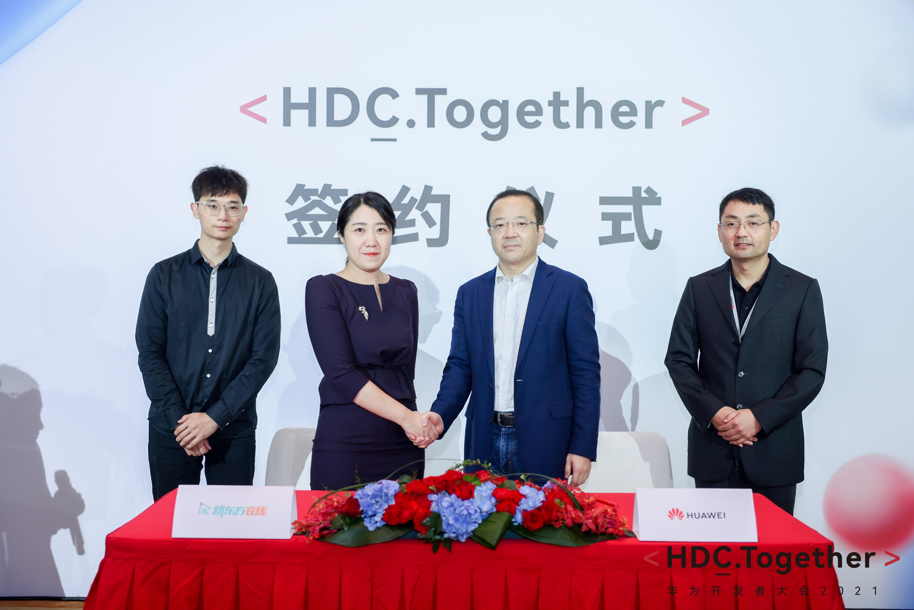 新东方在线对公事业部总经理侯实(左二)与华为消费者AI与智慧全场景业务部总裁王成录(右二)签署合作协议