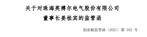 智通财经APP获悉,10月28日,深交所向珠海英搏尔电气股份有限公司(英搏尔,300681.SZ)董事长姜桂宾发出监管函。监管函指出,姜桂宾于 2021 年 9 月 27 日通过集中竞价交易方式卖出英搏尔股票 34,100 股,成交金额为 276.13 万元。英搏尔于 2021 年 10 月 27 日披露 2021 年三季度报告,姜桂宾卖出英搏尔股票的时间为英搏尔 2021 年三季度报告公告日前三十日内。
