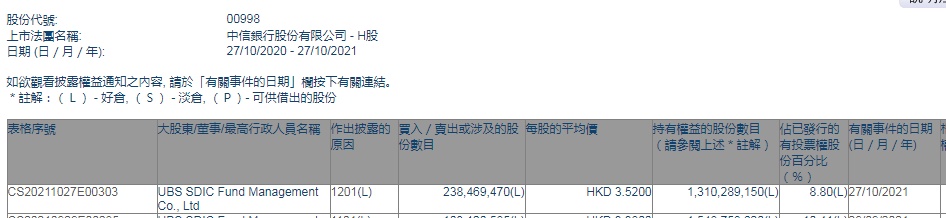 智通财经APP获悉,香港联交所最新资料显示,10月27日,UBS SDIC Fund Management减持中信银行(00998)2.3846947亿股,每股作价3.52港元,总金额约为8.39亿港元。减持后最新持股数目约为13.1亿股,最新持股比例为8.8%。