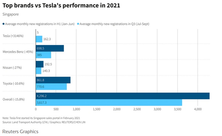 为了管理交通和污染,新加坡对汽车注册有着严格限制。新加坡上个季度的月均新车注册量较上半年减少了15.8%。这意味着,特斯拉的市场份额增长是以其竞争对手的损失为代价的。据统计,戴姆勒旗下梅赛德斯-奔驰和日产汽车第三季度月均新车注册量较今年上半年分别下降了45%和27%。