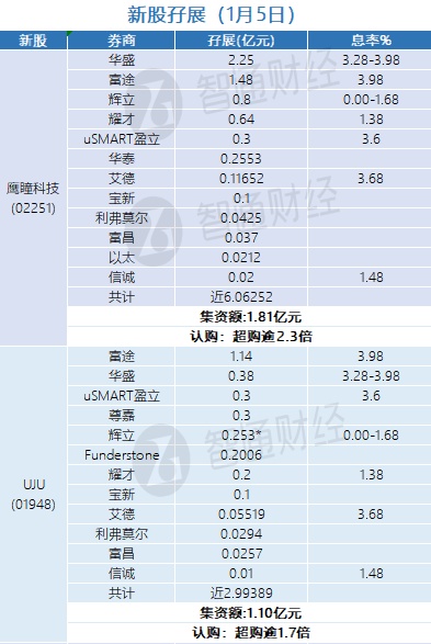 智通财经APP获悉,鹰瞳科技-B(02251)、UJU HOLDING(01948)正在招股中。截至10月28日,富途、耀才、辉立、华盛等合计分别为其借出孖展近6.06252亿港元、近2.99389亿港元。其中,鹰瞳科技-B超购逾2.3倍,UJU HOLDING超购逾1.7倍。