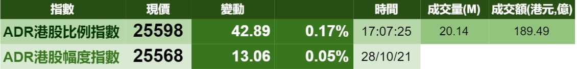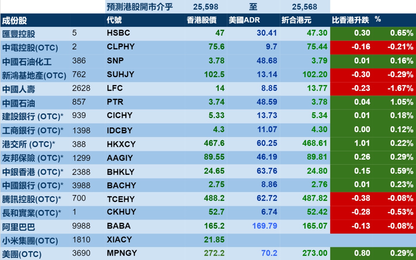 智通财经APP获悉,周四美股三大指数集体收涨,港股ADR指数上涨,按比例计算,收报25598点,涨42.89点或0.17%。