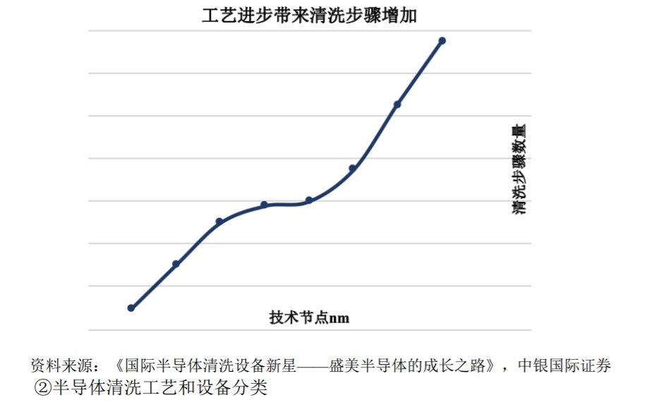 其二,清洗设备市场在整个制造工艺流程中极为关键,不可或缺。当前的芯片制造流程在光刻、刻蚀、沉积等重复性工序后均设置了清洗工序,清洗步骤数量约占所有芯片制造工序步骤的30%以上,是所有芯片制造工艺步骤中占比最大的工序,且随着技术节点的进步,清洗工序的次数和重要性将持续快速上升,设备体量比例将持续提升。