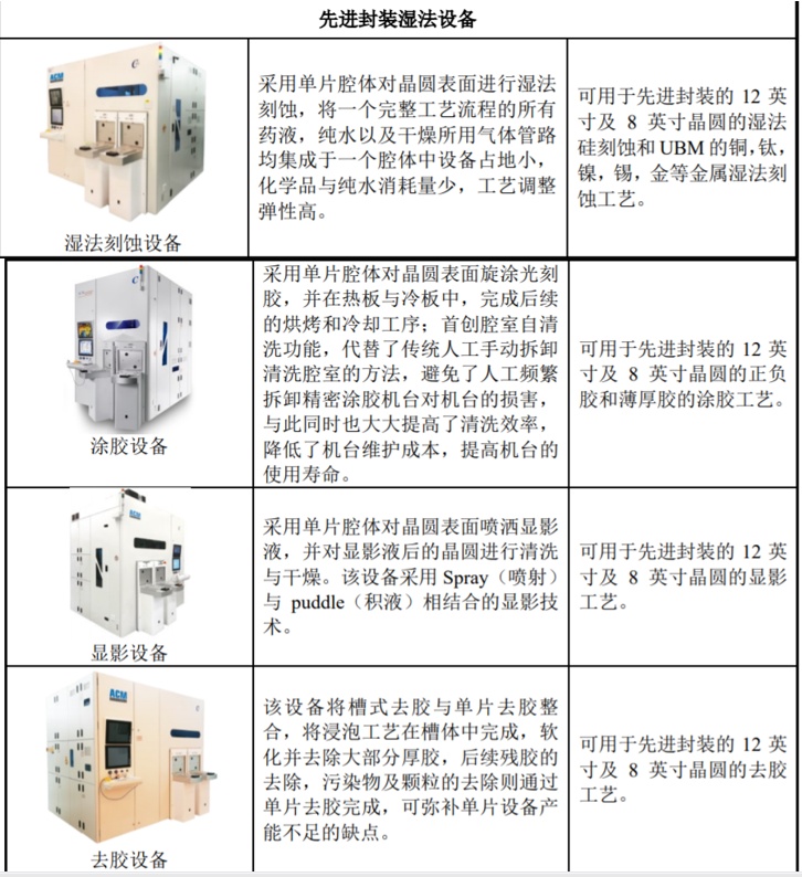而在先进封装湿法设备方面,盛美半导体基于先进的集成电路前端湿法清洗设备的技术,将产品应用拓展至先进封装应用领域。以先进封装的凸块封装的典型工艺流程为例,在整个工艺流程中涉及的单片湿法设备包括清洗设备、涂胶设备、去胶设备、湿法刻蚀设备、无应力抛光设备等。