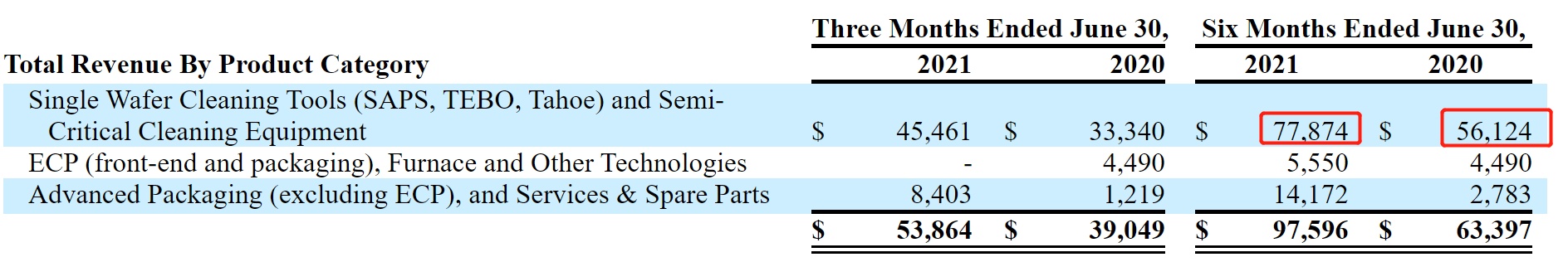 虽然多项新产品仍在验证期或部分新产品仍未放量,但盛美半导体的平台化发展策略已取得明显成效。据公司2021年上半年的财报显示,其报告期内的清洗设备收入为7787.4万元,占总收入的比例为79.79%,较2020年同期的88.53%下降近9个百分点;而先进封装设备和服务的收入占比则升至14.52%,同比提升超10个百分点。前端和封装的ECP产品、Furnace立式炉及其他产品则录得555万美元的收入。