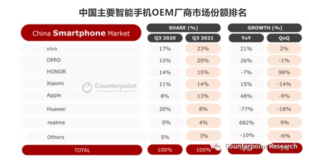 智通财经APP获悉,据Counterpoint Research数据显示,2021年三季度中国的智能手机销量同比下降9%,但环比增长3%,达到7650万部。由于需求疲软以及特别是4G SoC等零部件短缺,中国智能手机三季度的销量未能出现实质性改善。