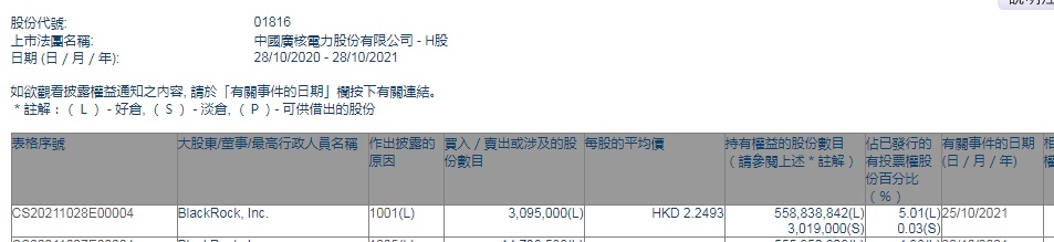 智通财经APP获悉,香港联交所最新资料显示,10月25日,贝莱德增持中广核电力(01816)309.5万股,每股作价2.2493港元,总金额约为696.16万港元。增持后最新持股数目约为5.59亿股,最新持股比例为5.01%。
