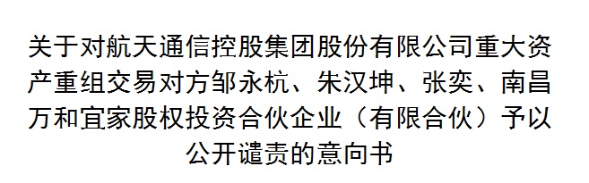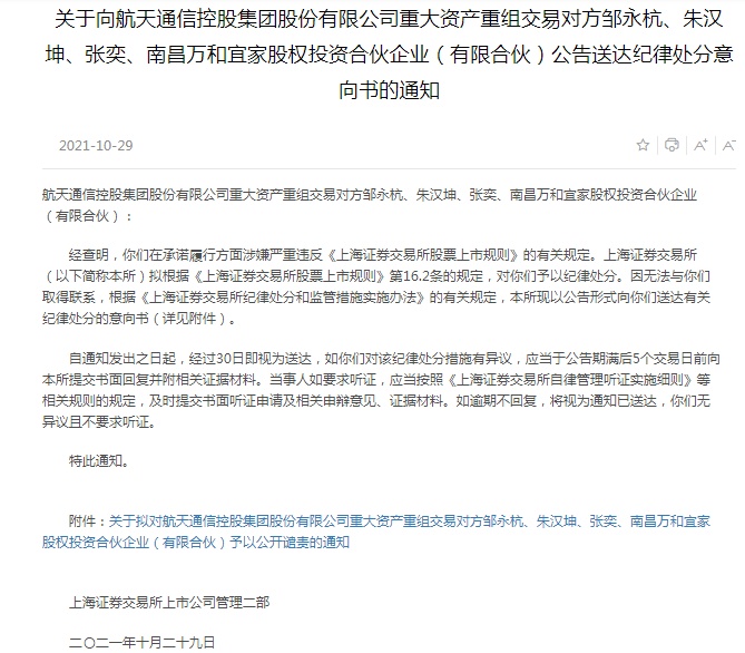 因无法与邹永杭等取得联系,上交所以公告形式向其送达有关纪律处分的意向书。鉴于上述违规事实和情节,上交所对航天通信控股集团股份有限公司重大资产重组交易对方邹永杭、朱汉坤、张奕、南昌万和宜家股权投资合伙企业(有限合伙)予以公开谴责。