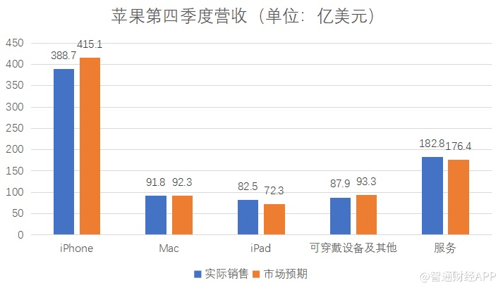 苹果本季度来自iPhone销售的收入为388.7亿美元,分析师预期415.1亿美元;Mac销售收入91.8亿美元,分析师预期92.3亿美元;iPad销售收入82.5亿美元,分析师预期72.3亿美元;可穿戴设备、居家用品、以及周边产品销售收入87.9亿美元,分析师预期93.3亿美元;服务销售收入182.8亿美元,分析师预期176.4亿美元。