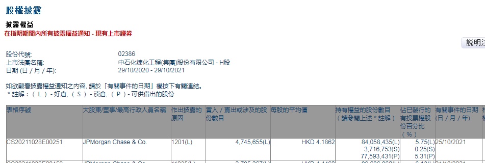 智通财经APP获悉,香港联交所最新资料显示,10月25日,小摩减持中石化炼化工程(02386)474.5655万股,每股作价4.1862港元,总金额约为1986.63万港元。减持后最新持股数目约为8405.84万股,最新持股比例为5.75%。