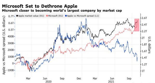 周五,苹果公司(AAPL.US)美股盘前下跌,令微软(MSFT.US)有望成为全球市值最大的上市公司。