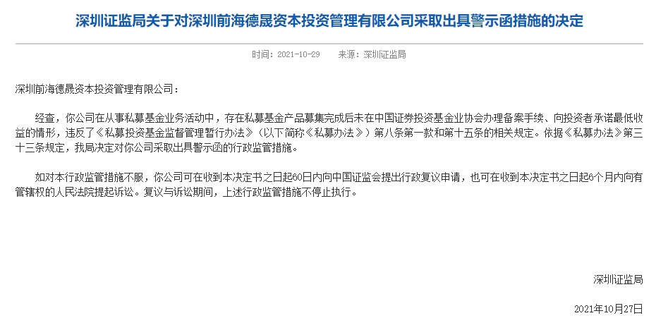 智通财经APP获悉,10月29日,深圳证监局公布对深圳前海德晟资本投资管理有限公司采取出具警示函措施的决定。经查,该公司在从事私募基金业务活动中,存在私募基金产品募集完成后未在中国证券投资基金业协会办理备案手续、向投资者承诺最低收益的情形,违反了《私募投资基金监督管理暂行办法》(以下简称《私募办法》)第八条第一款和第十五条的相关规定。依据《私募办法》第三十三条规定,深圳证监局决定对该公司采取出具警示函的行政监管措施。