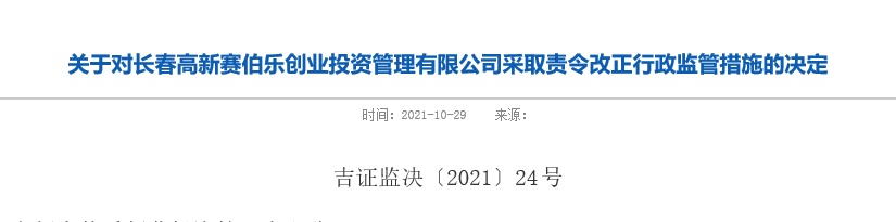 智通财经APP获悉,10月29日,吉林证监局对长春高新赛伯乐创业投资管理有限公司采取责令改正行政监管措施。经查,该公司存在以下行为:一、未及时填报并定期更新私募投资基金管理人及其从业人员的有关信息、所管理私募投资基金的投资运作情况。二、公司管理的私募投资基金吉林省高新技术创业投资有限公司2017年6月8日向长春赛融科技有限公司提供借款3,785,602.5元。上述行为违反规定,吉林证监局决定对该公司采取责令改正行政监管措施。