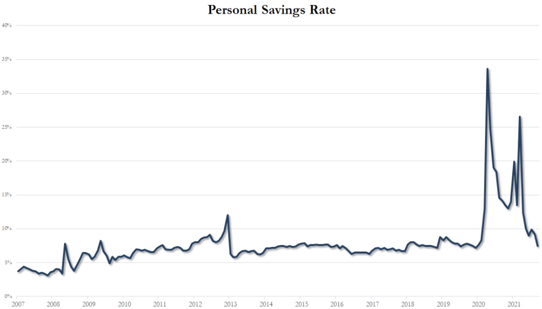 与此同时,由于政府转移收入大幅减少了7%,储蓄率降至7.5%,为2019年12月以来的最低水平。目前个人绝对储蓄只有1.336万亿美元。