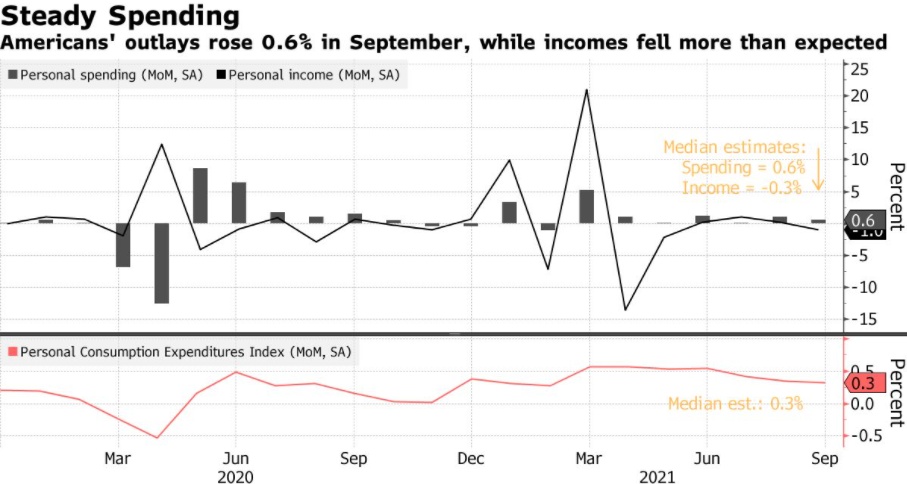 智通财经APP获悉,美国9月消费者支出强劲增长,面对全球供应紧张,汽车和其他商品短缺,通胀依然居高不下。