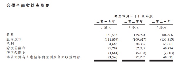 于截至2019年6月30日,截至2020年6月30日及截至2021年6月30日止年度,公司的收益分别为1.47亿港元、1.50亿港元及1.86亿港元。同期,公司的毛利分别为3468.6万港元、4036.6万港元及5455.1万港元。