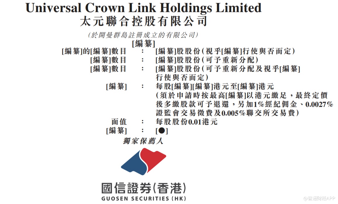智通财经APP获悉,据港交所10月29日披露,太元联合控股有限公司向港交所主板提交上市申请,国信证券(香港)为独家保荐人。