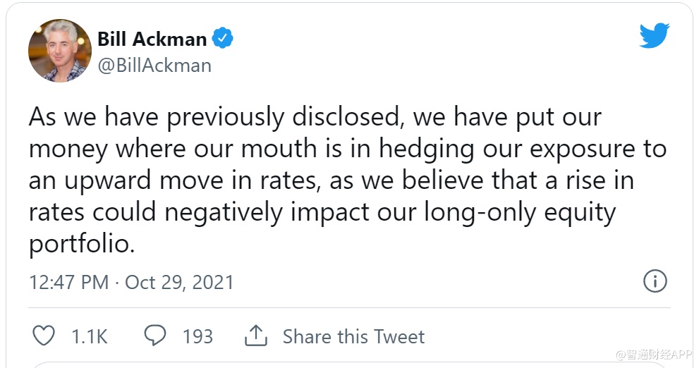 阿克曼指出,他已经开始为更高的利率定位他的投资组合。他在推特上表示:“正如我们之前所披露的,我们在对冲我们对利率上行的风险,因为我们认为利率上升可能会对我们的长期股票投资组合产生负面影响。”