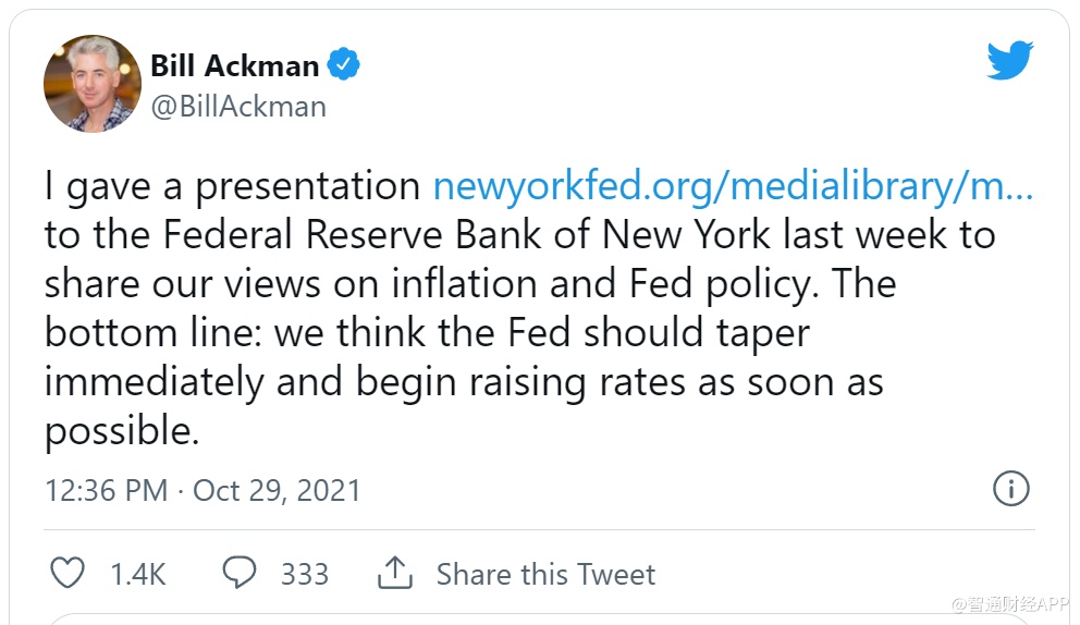 智通财经APP获悉,周五,亿万富翁对冲基金经理比尔·阿克曼呼吁美联储开始收紧其在新冠肺炎期间为美国经济提供的支持。阿克曼在社交媒体上表示,美联储应该立即缩减购债规模并尽快开始加息。