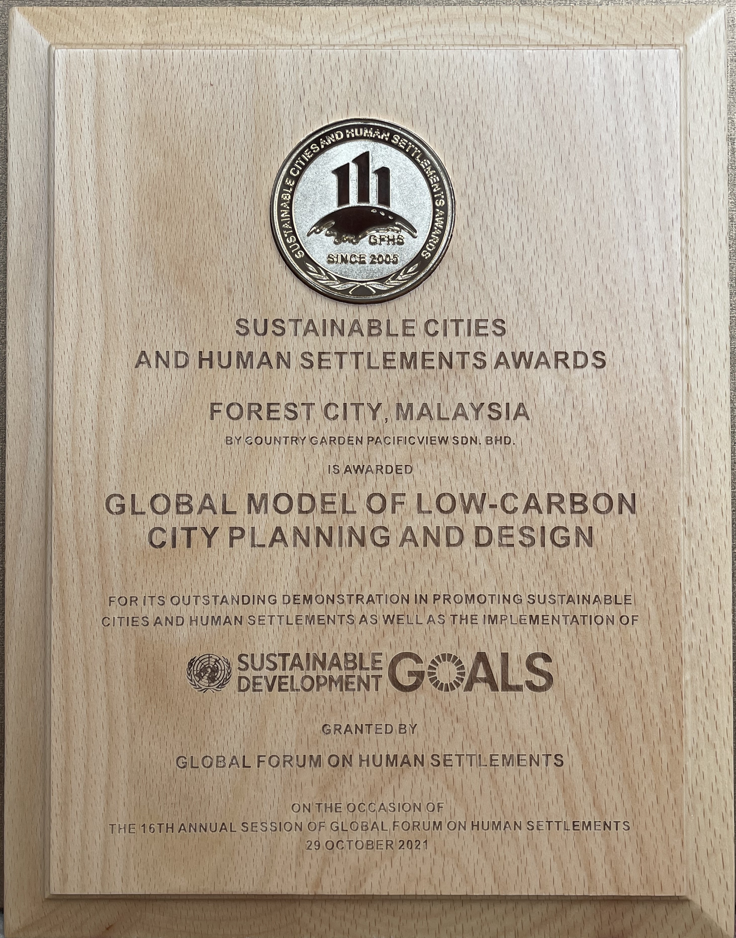 “可持续城市与人居环境奖盛典(SCAHSA·飒飒奖)”是2021“世界城市日”纪念活动——第十六届全球人居环境论坛年会(GFHS 2021)最大亮点环节。此前,碧桂园森林城市已连续五年获得飒飒奖奖项,包括“2020滨海生态环境保护范例奖”、“2019全球绿色智慧城市奖”、“2018全球产城融合范例奖”、“2017全球绿色建筑产业化示范园区奖”,以及“2016全球人居环境规划设计奖”。