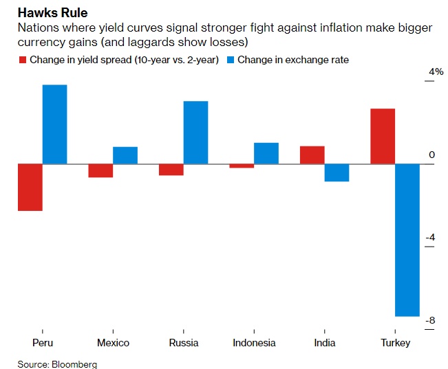 收益率曲线显示对抗通胀的力度更大的国家,其货币升值幅度更大(落后的国家则贬值)