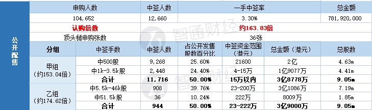 其中,公开配售申购人数104,652人,一手中签率3.30%,认购倍数约163.83倍。