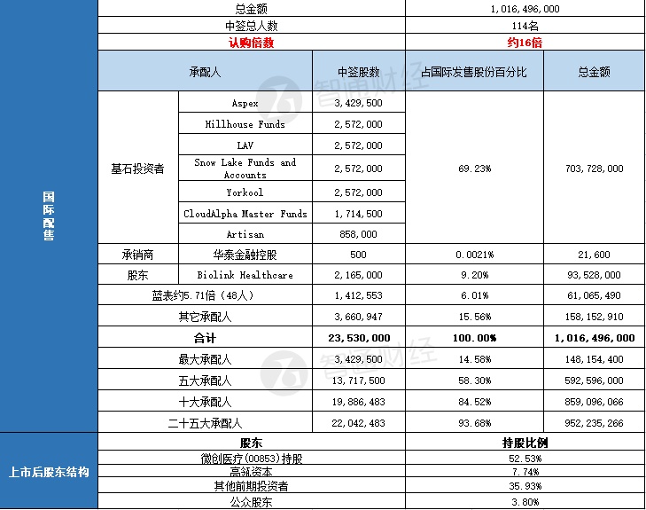 国际配售中签总人数114名,认购倍数约16倍。