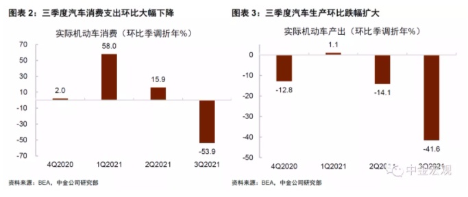 ** 消费方面,三季度整体消费支出环比增长仅1.6%,其中,汽车消费支出环比下降54%。汽车消费大幅下滑与生产瓶颈有关,三季度美国汽车产出环比下降42%,且是连续第二个季度下降。换句话说,汽车供给不足导致消费者有钱也买不到车,纵使有需求也“无处安放”。