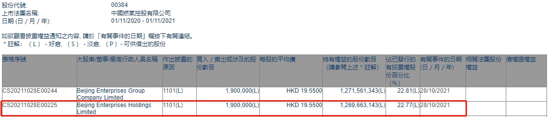 智通财经APP获悉,香港联交所最新资料显示,10月28日,Beijing Enterprises Holdings Limited增持中国燃气(00384)190万股,每股作价19.5500港元,总金额为3714.5万港元。增持后最新持股数目约为12.70亿股,最新持股比例为22.77%。