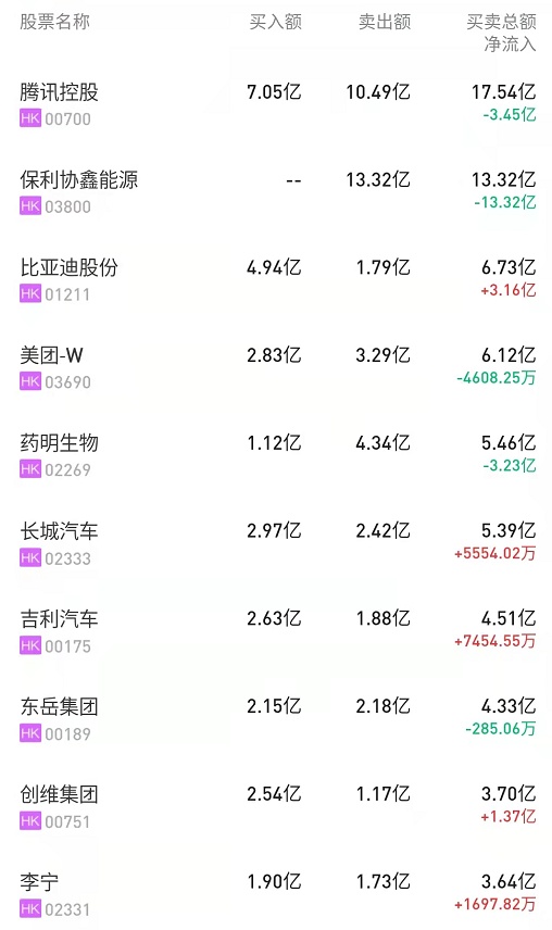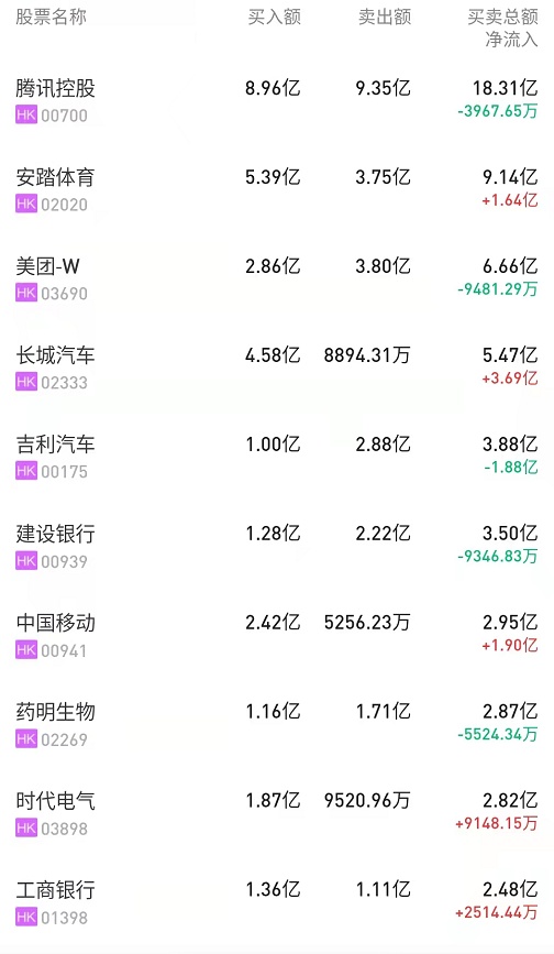 此外,中国移动(00941)、李宁(02331)分别获净买入1.89亿、1697万港元。而腾讯(00700)、建设银行(00939)分别遭净卖出3.84亿、9346万港元。