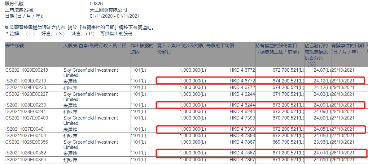 智通财经APP获悉,香港联交所最新资料显示,10月26-29日,天工国际(00826)行政总裁朱泽峰连续4日增持天工国际各100万股,每股分别作价4.7867、4.7393、4.6244、4.6772港元,总金额为1882.76万港元。增持后最新持股数目约为6.74亿股,最新持股比例为24.12%。