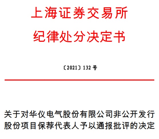 上交所做出如下纪律处分决定:对华仪电气股份有限公司非公开发行股份项目保荐代表人吴逊先、张宜生予以通报批评。