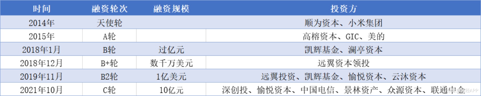 2014年,完成顺为资本、小米集团天使轮融资;2015年完成高榕资本、GIC和美的A轮融资;2018年1月 ,完成过亿元B轮融资,由凯辉基金领投,澜亭资本跟投;2018年12月,宣布完成由远翼资本领投的B+轮数千万美元融资;2019年11月,完成1亿美元的B2轮融资,资方包括远翼投资、凯辉基金、愉悦资本、云沐资本。