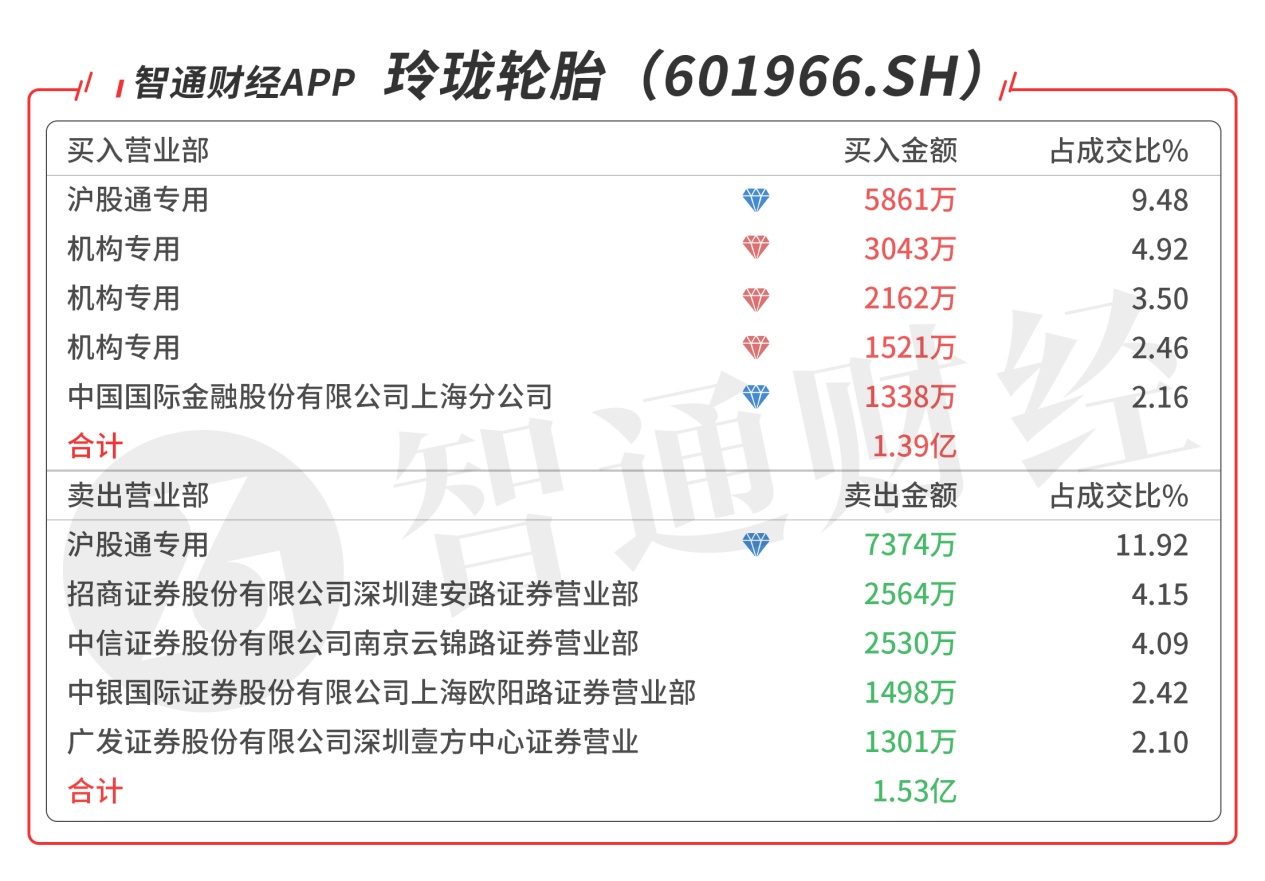 玲珑轮胎(601966.SH):受到众多机构青睐,今日共三个机构席位出现在龙虎榜单上,分别列买二,买三,买四,合计买入6725万元元,买五是知名游资的席位买入1338万元,沪股通对倒,其它均是游资卖出,该股今日强势反包,短期压力在年线附近。