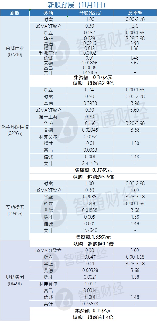 智通财经APP获悉,京城佳业(02210)、鸿承环保科技(02265)、安能物流(09956)和贝特集团(01491)正在招股中。截至11月1日,uSMART盈立、时富、富途、耀才、辉立、华盛等合计分别为其借出孖展近1.45106亿港元、2.44525亿港元、1.57648亿港元及0.36678亿港元。其中,京城佳业超购逾2.9倍,鸿承环保科技超购逾5.6倍,安能物流超购逾0.1倍,贝特集团超购逾1.4倍。