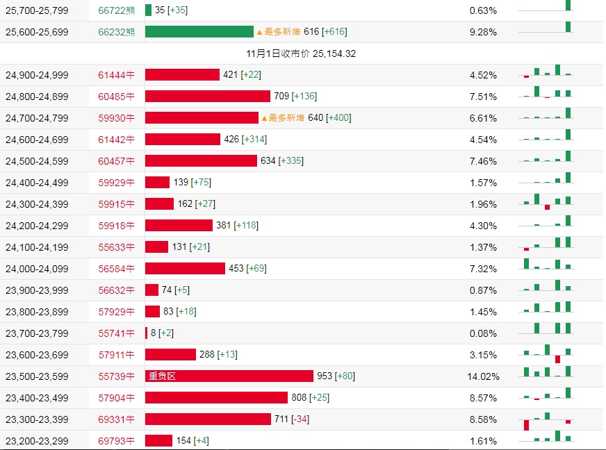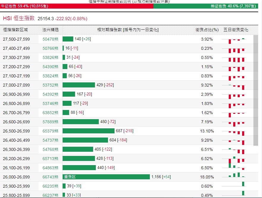 法兴恒指牛熊证街货分布图中的数据显示,熊证街货重货区在26,000-26,099区间,该区间最新熊证数量为1156张,较上一交易日增加54张;最多新增在25,600-25,699区间,该区间最新熊证数量为616张,较上一交易日增加616张。