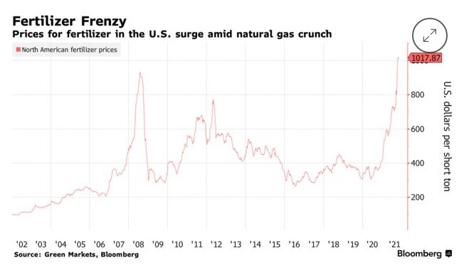 由于天然气价格飙升,美国化肥价格也随之飙升