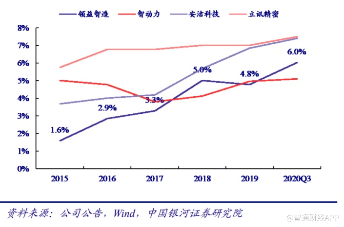 事实上,领益智造近些年对研发的投入市场早已有目共睹。据中国银河证券研究院的数据显示,自2017年以来,领益智造的研发费用率整体呈上升趋势,自3.3%一路升至2020年第三季度的6%,2020年全年的研发费用率则升至6.47%。与同行业的智动力、安洁科技、立讯精密等企业相比,领益智造是研发投入提升最为快速的企业之一。
