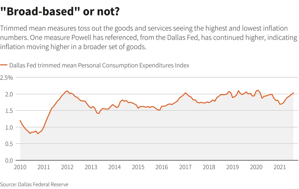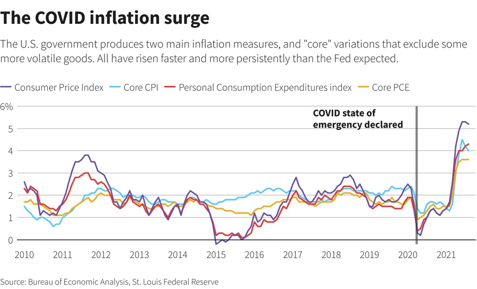 关于通胀,则有些令人困惑。起初,由于暂时的供应中断和消费者在某些供应短缺的商品上的支出激增,价格上涨的速度一直高于预期水平。