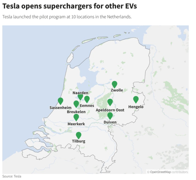 特斯拉周一表示,该项目将在荷兰的10个地点进行测试,并补充称,荷兰非特斯拉电动汽车司机可以通过特斯拉应用程序访问特斯拉超级充电站。