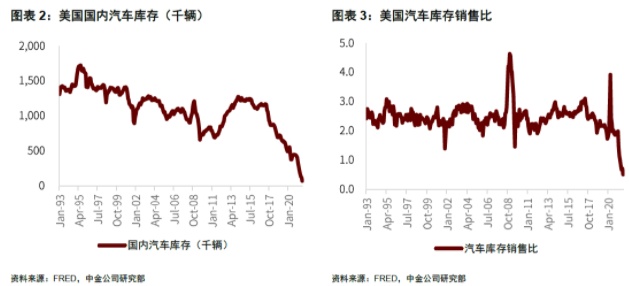 美国汽车库存续创历史新低,供给边际缓解,补库确定性强。据BEA数据,2021年9月,美国汽车库存仅为7.6万辆,环比-4.9万辆,而9月汽车库存销售比仅0.514,远低于2.0左右的历史均值水平,上述数据均创数据以来历史最低水平(图表2、3)。而此前美国因新车供给不畅,出现二手车价格倒挂现象,表明终端需求仍然较强。造成如此低库存原因,我们判断主要是供给端产能受到汽车芯片短缺和新冠疫情共同影响,往前看,伴随疫情汽车芯片供给改善和疫情常态化,我们认为美国汽车行业开启加库存的确定性强。我们以疫情前的库存中枢水平来进行测算,对应100万量级的补库空间。