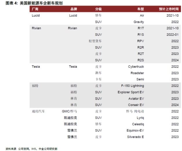 供给端,北美多家新老车企计划于2021四季度开始加速推出全新电动车型(图表4)。其中,美国“造车新势力”Lucid首款车型Air和Rivian首款车型R1T已于10月开启交付。传统车企中,通用汽车Ultium纯电动平台新车、福特F-150 Lightning纯电皮卡也均将于2022年实现交付。美国市场的纯电车型供给上有望迎来改善。